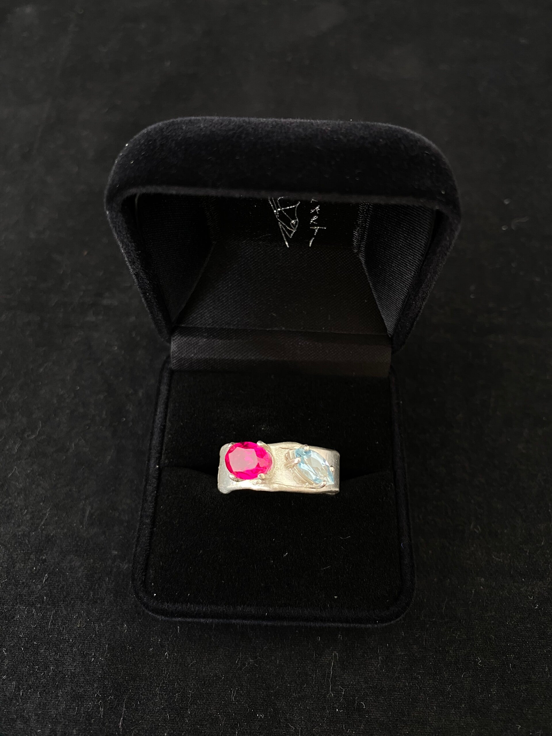 Handgemaakte ring door Huis Vikarti in Sterling silver met aquamarijn edelsteen en een synthetische robijn korund