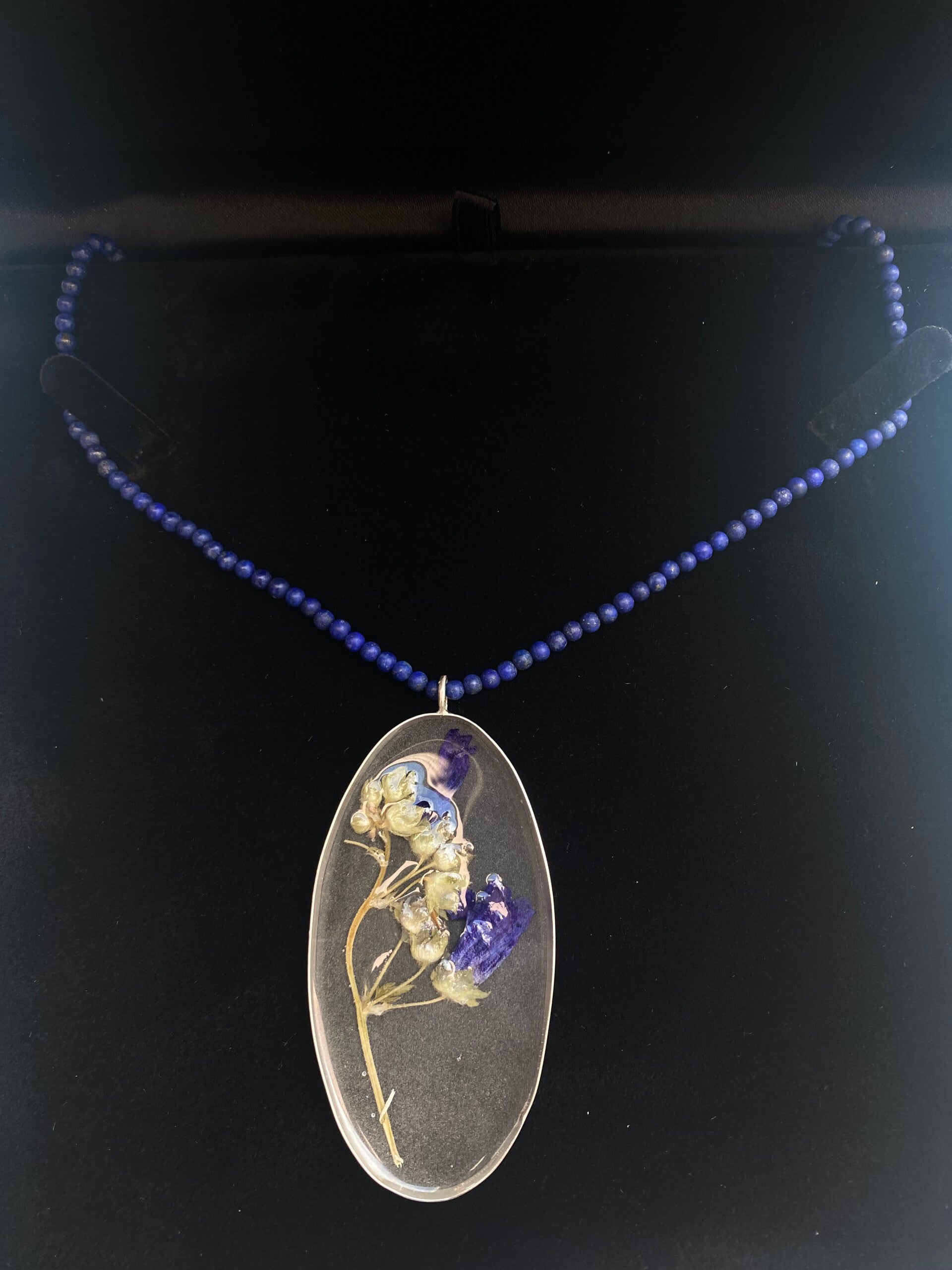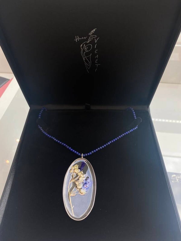 Handgemaakte hanger, zilveren zetting met bloem